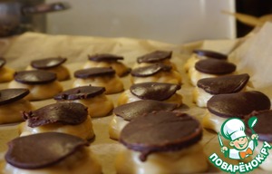 Выкладываем их сверху на профитроли. Отправляем в духовку при температуре 170 градусов на 20 минут. Потом уменьшаем температуру до 160 градусов и выпекаем профитроли еще 20 минут.