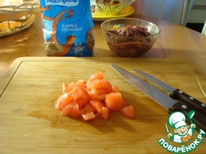 Лук с морковью обжарила, туда же отправила печень в муке потом помидор. И затем в кастрюлю к гречке и картошке.