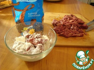 Печень моем, обсушиваем бумажным полотенцем, режем кусочками (как вам нравится) и обваливаем в муке.