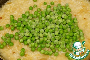 После добавления последней порции бульона я добавила горошек, так как он у меня замороженный, если добавлять свежий горошек, то это нужно сделать немного позже.