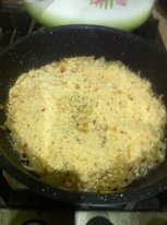 Нагреваем сковороду. режем лук и обжариваем до лёгкого золотистого цвета. Затем к луку добавляем сухари, перемешиваем.