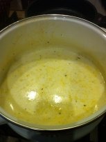 Теперь очередь соуса: в кастрюлю наливаем воду и сливки. Солим., Доводим до кипения. Отдельно в чашке смешиваем муку и воду 1:1, что бы не было комочков, постепенно добавляем ещё воды до более жидкого состояния. Когда будущий соус закипел медленно вливаем муку и быстро мешаем, опять довести до кипения.