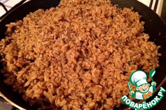 • Рис промыть и отварить обычным способом (я варю в подсоленной воде на медленном огне под крышкой без предварительного обжаривания) в течение 10 минут. Затем воду слить, рис залить подсоленным бульоном, довести до кипения и варить на слабом огне до полного выкипания жидкости. (Я в рис еще добавляю прованские травы. Но это по желанию.)