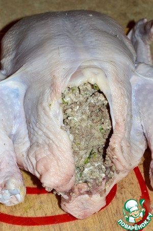 Зашить или заколоть отверстие."Заправить" - перевязать курицу, чтобы ножки, крылышки и шея держались на своих местах во время приготовления и курица на столе выглядела аккуратно. Французы заправляют курицу "в две нитки". Первый узел завязывают возле хвоста, чтобы скрепить ножки, а второй - на грудке, чтобы зафиксировать крылышки и шею.