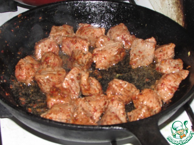 Пока овощи обжариваются, нарезаем говядину крупными кусочками, и отправляем на другую разогретую сковородку обжариваться (лучше взять чугунную сковороду).