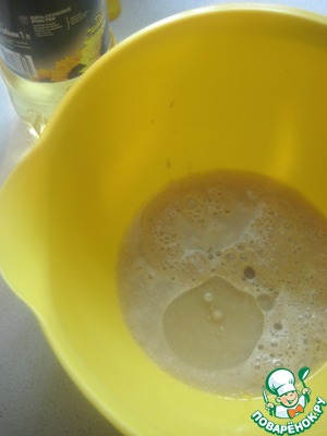Берем миску, в которой будем замешивать тесто. Выливаем "заигравшую" дрожжевую смесь, добавляем растительное масло.