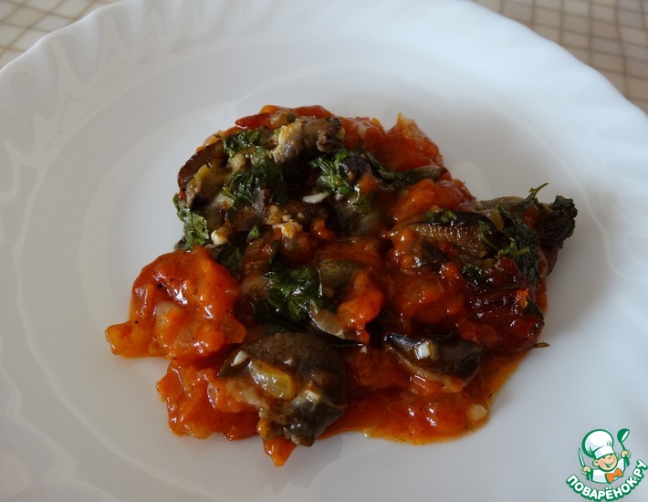 Обжарить лук в глубокой сковороде до золотистого цвета, добавить мясо улиток, влить полстакана белого вина, посыпать белым молотым перцем и солью по вкусу. Если жидкости мало, можно добавить бульон от варки, тушить под крышкой около 30 минут, изредка помешивая, чтоб не пригорало. Затем посыпать мукой, добавить помидоры кубиками, перемешать, выдержать на слабом огне 10 минут.