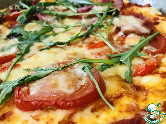 Выпекать 2-3 минуты при температуре 200-220 градусов. Затем основу достать и посыпать тертым сыром и поместить на минуту в печь. Затем снова достать и выложить мясо или бекон ( то чем вы располагаете). И снова поместить на пару минут в печь. Последним этапом достать пиццу, посыпать рукколой и сыром.