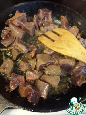 Итак, растопить масло, нарезать кусочками печень и быстро обжарить её со всех сторон. Выключить плиту, печень накрыть крышкой и оставить доходить на выключенной плите, посолить и поперчить -