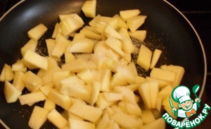 Яблоки очистить от семечек и кожуры, нарезать кубиками. Растопить масло, положить на сковороду яблоки и насыпать сахар, томить на небольшом огне около 10-15 минут, чтобы яблоки стали мягкими и покрылись карамелью