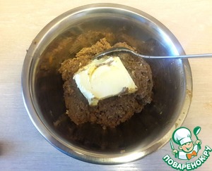 У нас осталось 100 г масла. Делим их пополам. Половину кладем в паштет и хорошо вымешиваем. Попробуйте - если необходимо добавьте соль и перец -