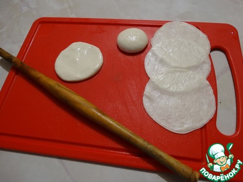 Вот тут выяснилось, что скалка скалке рознь! Обычная большая не подошла, слишком грубо работает. А узенькая, доставшаяся от бабушки, великолепно раскатывает наше "тесто". Так как сырное тесто имеет свойство быстро твердеть и рваться, а без опыта и сноровки получаемые лепешки не совсем аккуратные, решила обрезать края по размеру пиалы. Заодно и размер лепешек, к моей радости, получился одинаковый. Правда, настоящие грузинские сулугунные лепешки несколько больше моих, поэтому, мои и мини.
