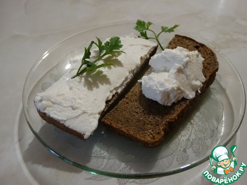 Когда сыворотка сверху станет прозрачной и на дне будут видны сырные хлопья, можно приступить к отцеживанию. Дуршлаг выкладываем х/б тканью (марля не годится!), частями выливаем нашу сыворотку. Сверху дуршлаг прикрываем крышкой. Когда сыворотка стечет, а на ткани останется густая масса, похожая на деревенскую сметану, можно собрать рикотту в посуду. И как тут не удержаться и не намазать кусочек черного хлебушка свежей рикоттой!