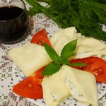 На блинчик сулугуни выкладываем 1 ч. л рикотты, размазываем тонким слоем и сворачиваем вчетверо. Блюдо готово!