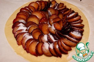 Достать тесто из холодильника и прямо с бумагой поместить на противень, посыпать тесто сахаром 15 г. Выстелить кусочки сливы внахлест и посыпать их сахаром 25 г оставив немного для бортиков. Не переживайте, в сливе очень много пектина и в союзе с сахаром она быстро жеилируется, сок вытекать не будет.