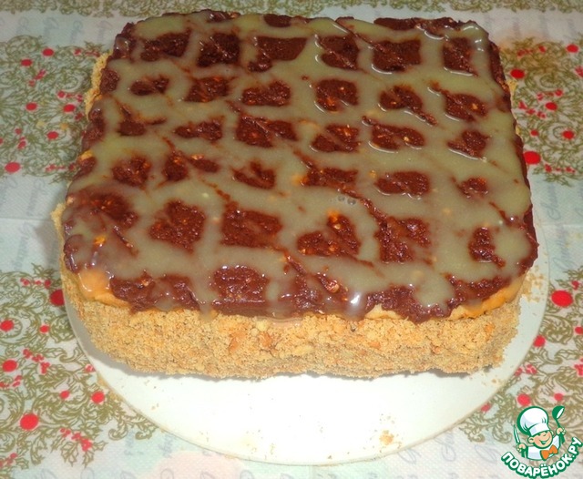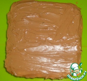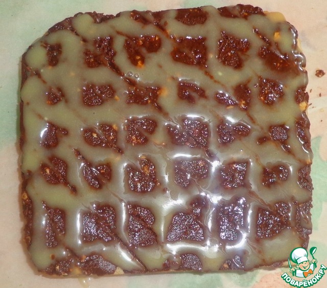 Молочный шоколад с орехами растопить и покрыть им один корж. Растопить белый шоколад и сделать сеточку. Корж поместить в холодильник для застывания.