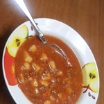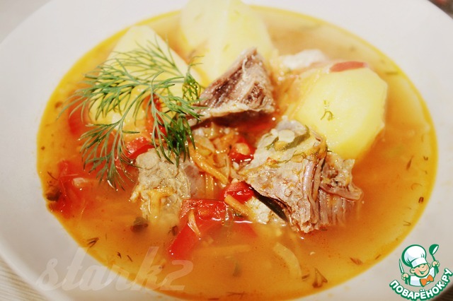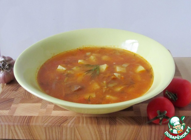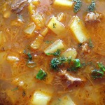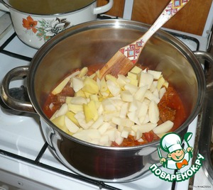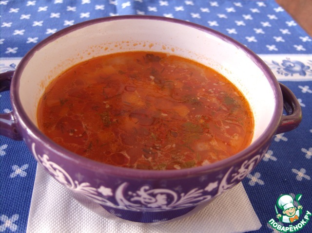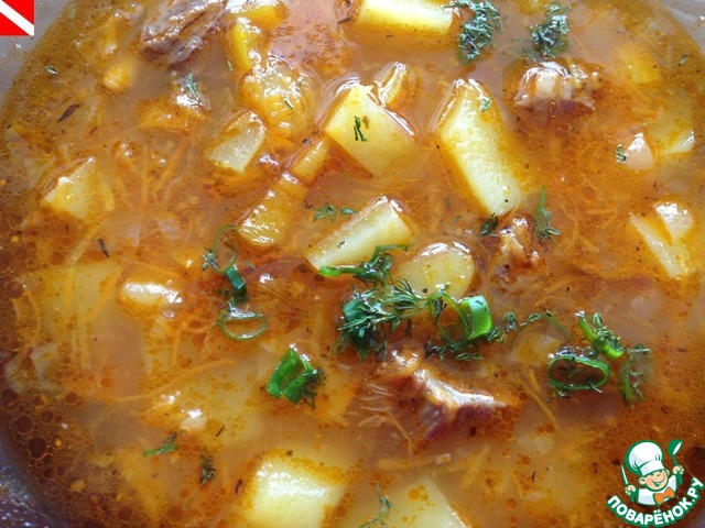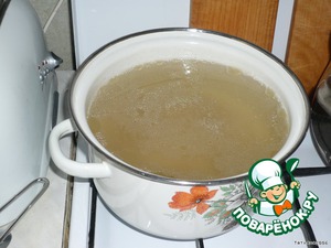 До обжарки я сварила бульон из мяса с сахарной костью (приблизительно 3 литра). Затем вытащила мясо, нарезала кусочками и чуть обжарила с луком, бульон процедила. -