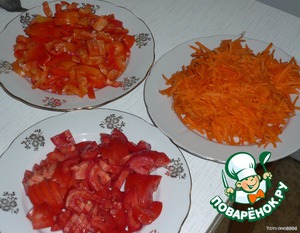 Далее подготавливаем овощи. Трем морковь, режем помидоры и перец.