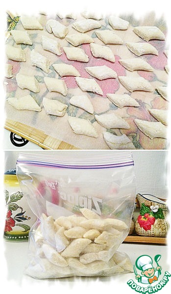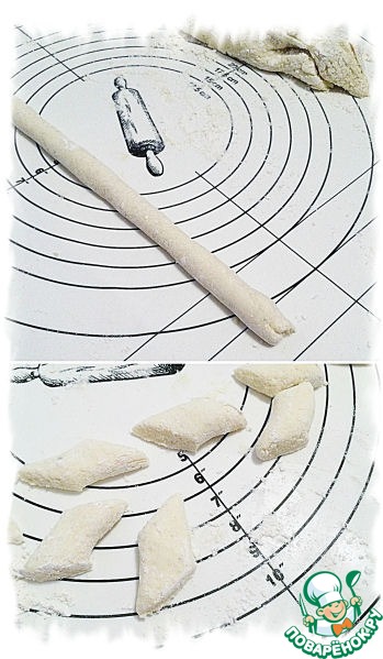 Взять часть "теста", примерно 1/2 - 1/3 и сформировать (раскатать руками) колбаску толщиной в палец. Масса липкая, так что не забывайте присыпать руки и рабочую поверхность по мере необходимости мукой. Нож тоже приыпать мукой и разрезать колбаску на одинаковые кусочки (подушечки, ромбики) длиной примерно 3 см.