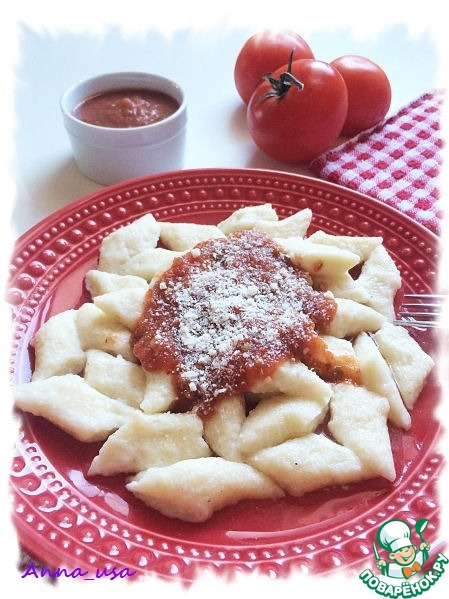 Вариант первой подачи:выложить готовые ньокки на порционную тарелку, сверху полить томатным соусом и присыпать натёртым на мелкой тёрке пармезаном. Томатный соус может быть ппокупной, а можно сделать самому. Я делаю вот по этому рецепту: http://www.povarenok .ru/recipes/show/560 75/