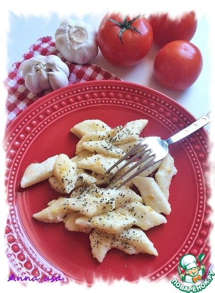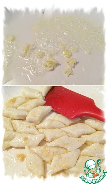 Вариант второй подачи: растопить в сковороде сливочное масло, выдавить в него чеснок. Обжaрить масло с чесноком секунд 10. Выложить в сковороду с чесночным маслом готовые ньокки и обжрить всё вместе 1-2 минуты.