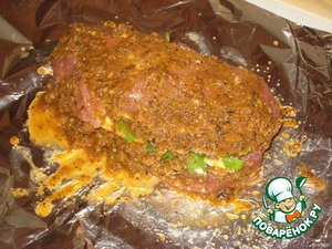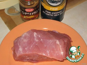 • Кусок мяса немного посолить, поперчить, смазать 1 ч.л. горчицы, хорошо втереть все это в мясо и убрать на ночь в холодильник.