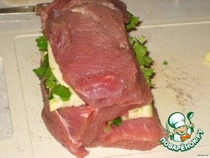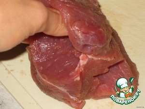 Отступив сверху немного, кусок мяса надрезать вдоль с одной стороны, не разрезая до конца, получается при развороте как книжка.