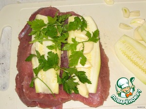 Раскрыть мясо с одного разреза, развернутую часть немного посолить, поперчить, вложить ломтики кабачка, чеснока и свежую петрушку.