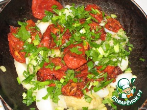 • На гарнир был очень вкусный омлет, обжарила оставшийся кабачок, добавила вареной картошки И…. хочу обратить внимание, вяленые помидоры, по Леночкиному (elena 110) рецепту https://www.povarenok.ru/recipes/show/11027/ , не могу перестать восхищаться, ну настолько вкусные получаются. Такие помидорки хоть куда и хоть с чем, да и просто так безумно вкусно.