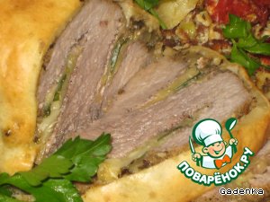 Нежное, сочное, ароматное мясо, фаршированное кабачками и чесноком, в винно-яблочном соусе. По идее я не планировала, но видимо от избытка чувств, одела мясо в шапочку )))))) сырную, получилось очень даже неплохо, сырная оболочка пошла в дело в качестве хлебушка ))