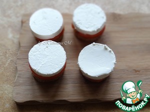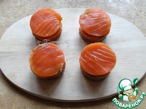 На хлебцы выложить семгу, вырезанную тем же диаметром; -