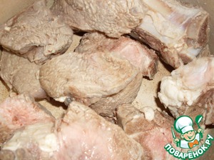 Мясо разрезаем на 6 частей, промываем и оставляем в холодной воде на 1 час. Воду сливаем. Кладем мясо в кастрюлю. Вливаем 3 стакана воды и уксус, добавляем 1 ст. ложку соли и доводим до кипения. Варим на слабом огне 10 минут. Воду сливаем. Заливаем свежей холодной водой и даем остыть. Эту воду тоже сливаем.