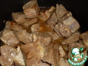 Разрезаем каждый кусок отварной телятины на 4 части и слегка обжариваем в жаровне в 4 ст. ложках сливочного масла. Добавляем вино и держим на слабом огне до тех пор, пока жидкость не убавится наполовину.