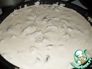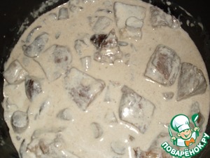 Одновременно растапливаем на другой сковороде оставшееся сливочное масло, обжариваем в нем грибы в течение 5 минут, смешиваем с концентрированным мясным бульоном и сметаной, кладем оставшуюся соль (1 ч. л.) и перец.