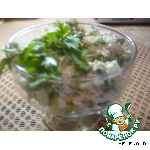 Режем мелко яйца,св.огурцы, трём сыр и добавляем зел.горошек и измельчённую зелень.