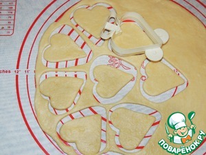 Оставшуюся часть теста раскатать чуть потоньше и вырезать из нее "сердечки" выемкой для печенья. Мне понадобилось 20 "сердечек".