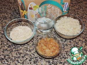 Для начинки полстакана рисовых хлопьев запарить таким же количеством кипятка. Лук мелко порезать и обжарить в небольшом количестве растительного масла до золотистого цвета. Смешать готовый рис, лук и хлопья (добавление хлопьев делает начинку более легкой и нерассыпающейся при нарезке пирога).