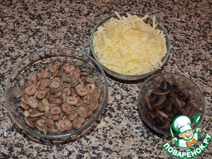Шампиньоны порезать и также протушить под крышкой до испарения жидкости. Остывшие сердечки нарезать тонкими кружочками и перемешать с грибами. Сыр натереть на крупной терке.