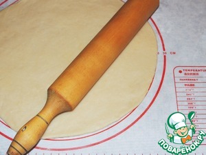 Тесто разделить на две части (2/3 и 1/3). Большую часть раскатать по диаметру формы с учетом высоты бортиков. Перенести пласт в форму (у меня силиконовая диаметром 24 см).
