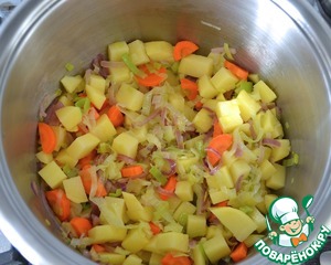 Подготовьте овощи. Нарежьте морковь, порей и шалот полукольцами. Картофель очистите и нарежьте небольшими кубиками. На сильном огне в сотейнике обжарьте, помешивая, оба вида лука на смеси оливкового и сливочного масел до легкого золотистого цвета.