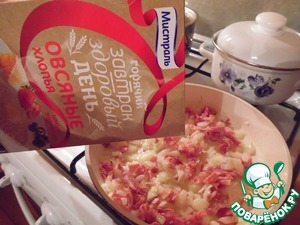 К луку и бекону добавить овсяные хлопья ТМ "Мистраль", обжарить 3–4 минуты.