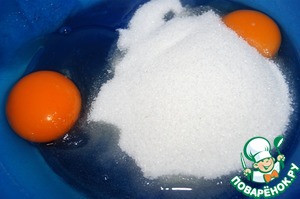 Яйца и сахар поместить в емкость для взбивания. В этом случае мы будем взбивать их сразу вместе.