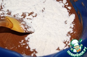 Добавить просеянную муку и опять осторожно перемешать лопаточкой.