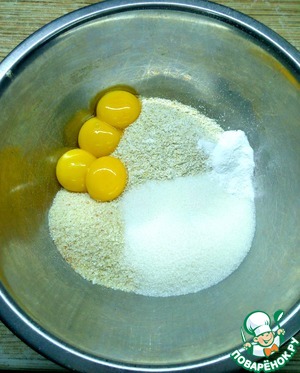 Желтки отделить от белков. Желтки добавить к муке из хлопьев. Туда же добавить сахар, разрыхлитель, корицу и кефир.