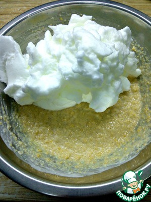 Белки взбить до крепких пиков и аккуратно, лопаткой вмешать белки в тесто.