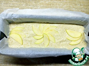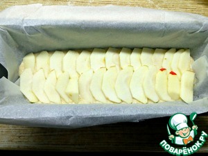 Половину теста выложить в форму. Выложить сверху слой яблок.
