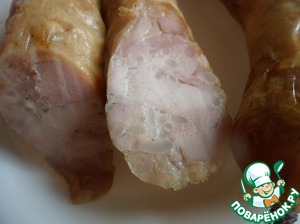 Для начала нужно определиться, какая колбаса Вам понравится больше: посуше или пожирнее. В первом случае нам потребуется куриная грудка, во втором бедро или голень. Мне нравится когда присутствует и то, и другое - не сухо и не жирно. И так мы определились, теперь приступаем непосредственно к приготовлению. Отделяем от костей, рубим небольшими кусочками курицу (примерно 2*2 см), добавляем рубленный чеснок, соль, перец, немного воды и тщательно вымешиваем фарш.
