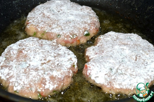 В сковороде разогреть 2 ст. л. сливочного и 1 ст. л. растительного масла. Котлеты приплюснуть ладонью, чтобы они стали толщиной 1 см. Обваляйте их в муке и обжарьте по 5 минут с каждой стороны, затем накройте крышкой и жарьте еще 7-10 минут, перевернув один раз.