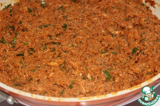 В сковороду с мясом положить петрушку и прогреть ещё минуту. Затем снять с огня и перемешать с тёртым сыром. -