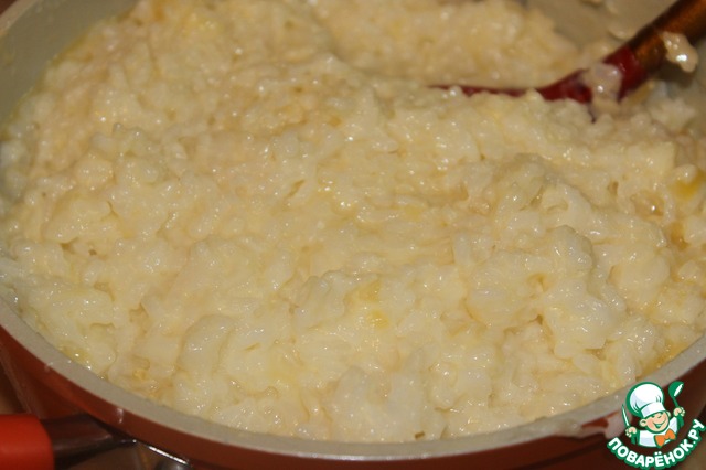 Отварить рис до готовности, перемешать со сливочным маслом и натёртым сыром. Добавить взбитое яйцо и хорошо перемешать.